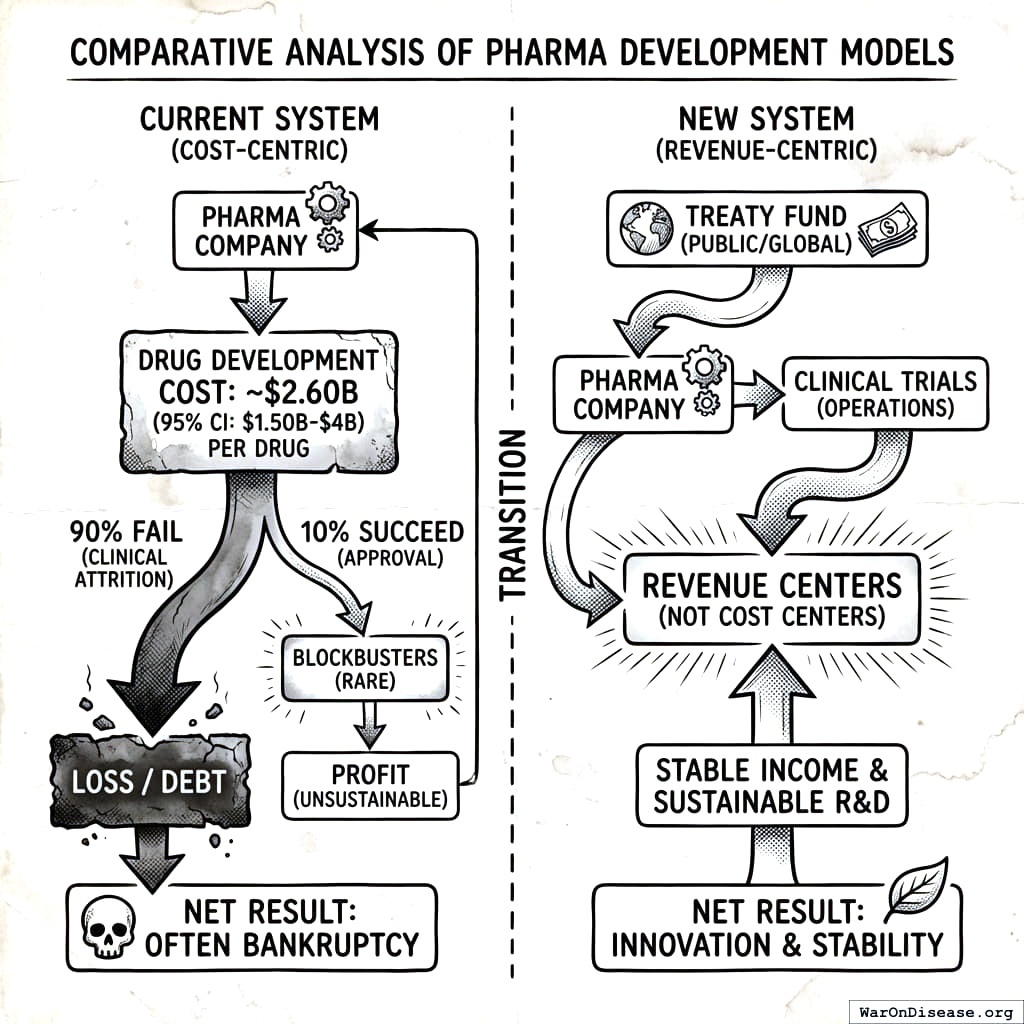 Pharma currently pays $2.6B per drug. 90% fail. This is called “drug development.” On Wishonia, we have a different word for spending billions with a 10% success rate. We call it “gambling.”