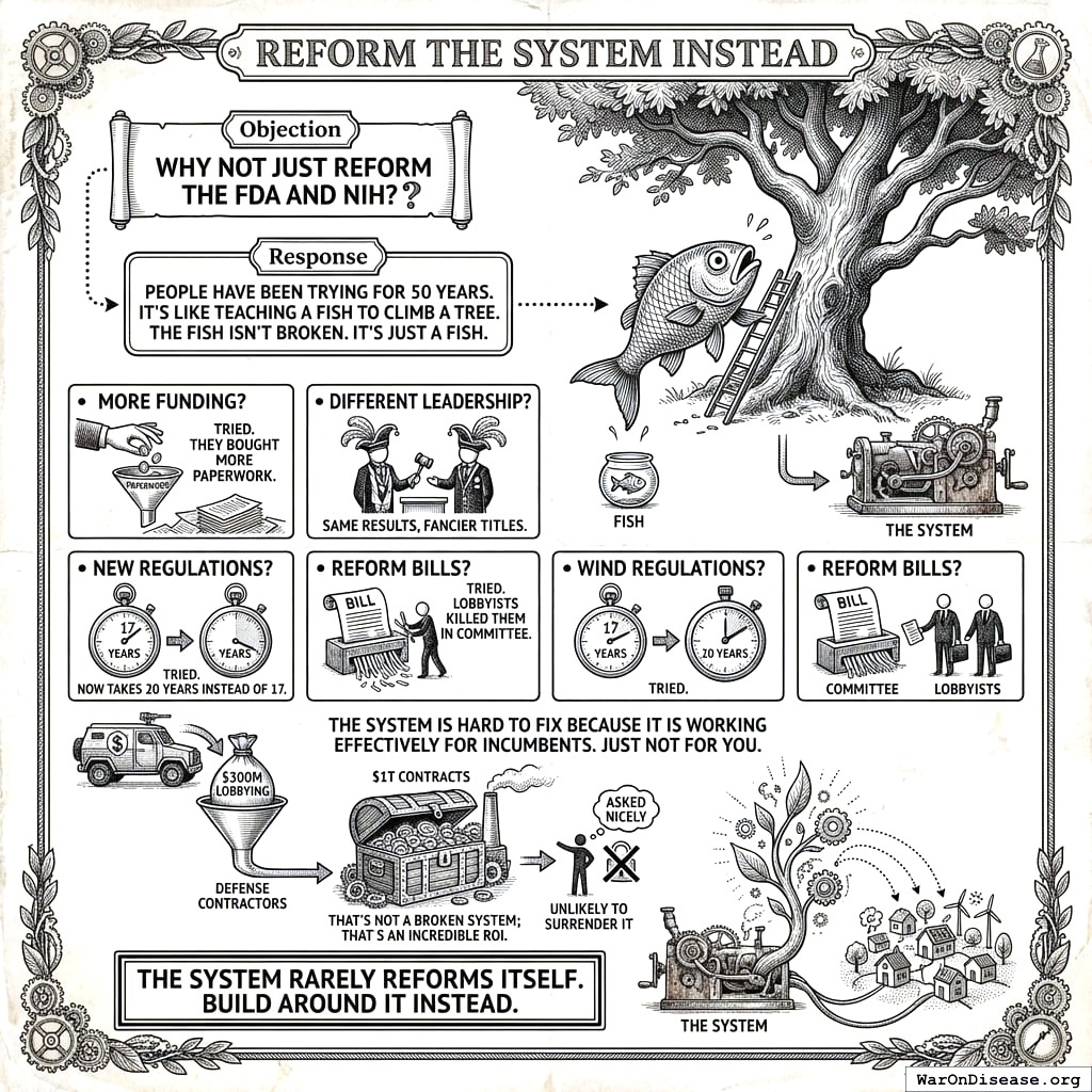 Your decentralized framework will run 44.1x more trials for the same budget. Even if 90% fail, you get over 4x more cures than today. Failure at scale beats success at a standstill. On Wishonia, we considered 90% failure rates normal for the first 200 years. Then the failure rate dropped because we had data. You don’t have data because you’re afraid of failure. You’re afraid of failure because you don’t have data. This is a circle. I keep finding circles in your systems. None of them are the good kind.
