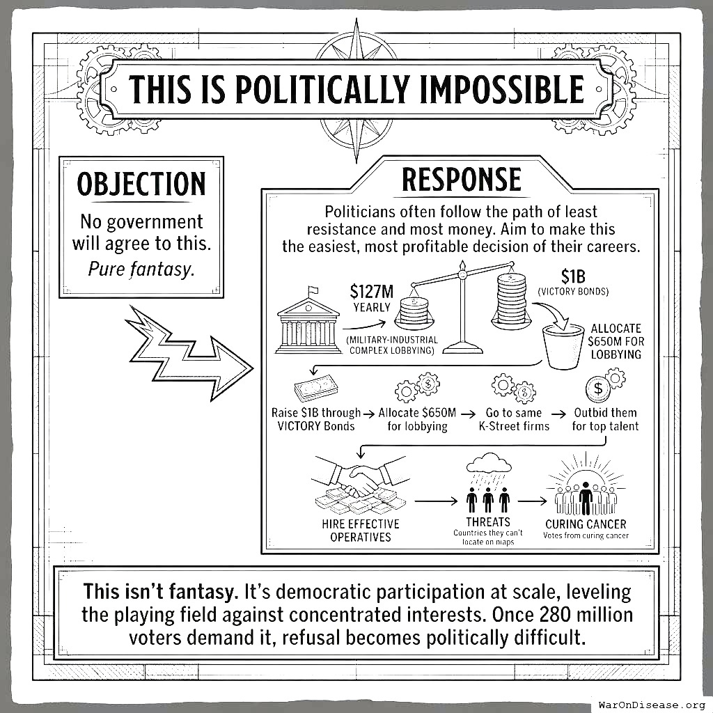 “Politically impossible” is a phrase that means “the bribes currently flow in a direction I’m comfortable with.” The small pieces of paper with presidents on them go to people who build missiles instead of people who cure diseases. You need the papers to go the other way. This is called “lobbying,” which is bribery but with a business card and a 501(c)(4).