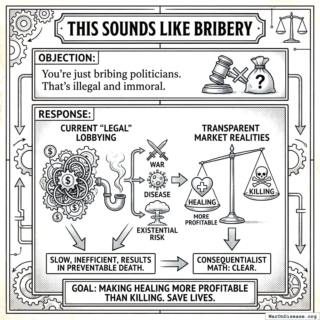 The military-industrial complex spends $127M yearly on lobbyists. You can’t beat them with moral arguments (they’re immune; moral arguments have a $0 budget and no K Street address). Beat them at their own game. Raise $1B through VICTORY Incentive Alignment Bonds140. Allocate $650M for lobbying. That overwhelms the defense industry’s $127M spend. Go to the same K Street firms. Outbid them. Lobbyists work for the highest bidder. They always have. This is the one area where your species’ mercenary instincts are genuinely helpful.