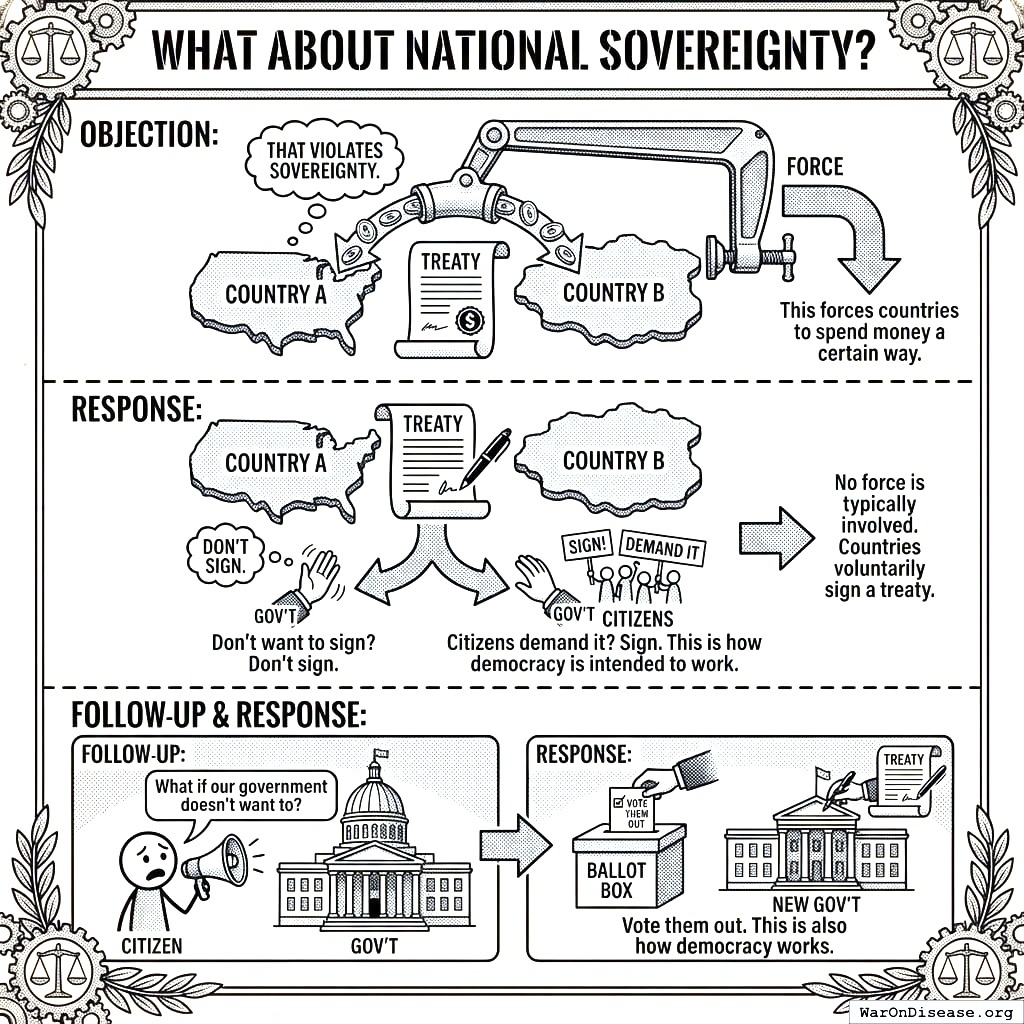Sovereignty means “we decide what happens to us.” The treaty asks countries to decide. Countries that don’t want to may decide not to. Countries that do want to may decide to. Sovereignty remains intact throughout. That is how deciding works. I checked with your dictionaries. They agree with me.