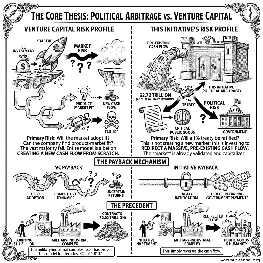 Your risk: Will your 1% treaty136 get ratified? That’s it. You’re not creating a new market. You’re redirecting a pre-existing cash flow ($2.72 trillion in annual military spending64). The “market” already exists. It’s fully capitalized. Your species is already spending the money. You’re just changing what it buys.