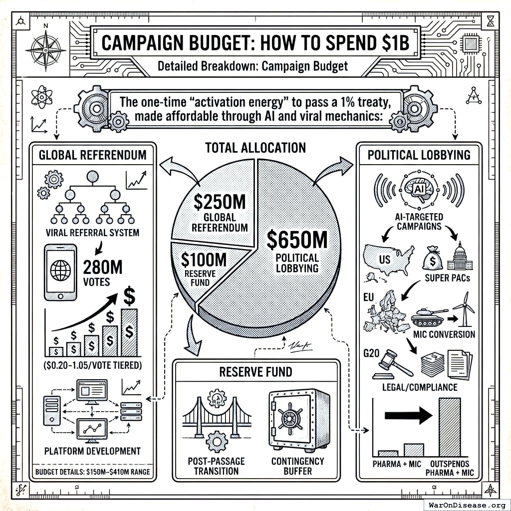 Why $1B? Your opposition spends $450M/year to keep things exactly as terrible as they are (pharma lobbying at roughly $300M/year plus the military-industrial complex at roughly $150M/year). A subscription to suffering. You raise $1B ONCE to pass a treaty that generates $27.2B/year FOREVER. Over a 10-year campaign, opposition spends roughly $4.5B to your $1B. But their $450M/year is spread across thousands of contracts and dozens of incumbents. Your $1B is aimed at a single treaty. Concentrated offense beats diffuse defense. This is military strategy, which is ironic, and also the only kind of strategy your species respects.