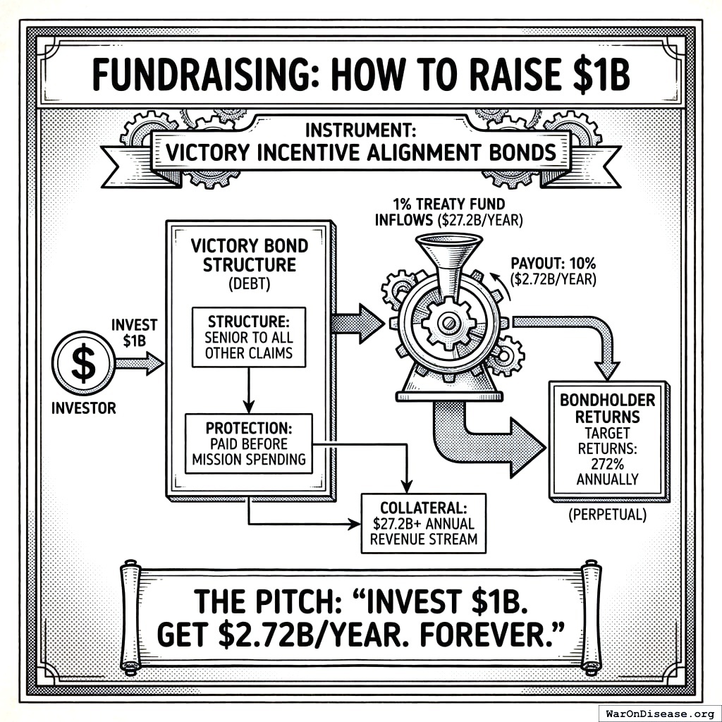 The instrument is a VICTORY Incentive Alignment Bond, a perpetual contractual claim on a fixed share of treaty inflows: give us money now, get much more money later, for as long as the treaty survives. On Wishonia, this would still be called “fraud.” On Earth, it’s a contingent revenue share backed by the treaty’s future cash flows if the treaty passes.