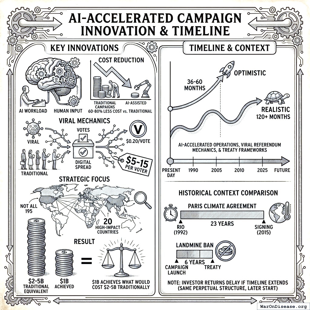 Viral referendum mechanics bring the cost down to $0.20/vote at the optimistic lower bound (base case $0.50-0.89), compared to $5-15 per voter through traditional channels. Getting someone to click “I prefer not dying” costs less than getting someone to click “I prefer Pepsi.” You also focus on 20 high-impact countries, not all 195. You don’t need Liechtenstein’s permission. Liechtenstein has 39,000 people. That’s a concert venue, not a geopolitical obstacle.