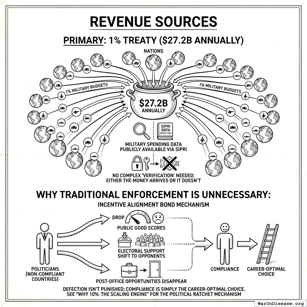 100+ nations contribute 1% of military budgets. Not because they’ve had a moral awakening. Because the Incentive Alignment Bond mechanism makes compliance self-enforcing: politicians in non-compliant countries watch their Treaty Support Scores fall, the 1% Treaty-specific subtype of the Public Good Score, independent PACs redirect millions in campaign funding to their opponents, and their post-office career options shrink from WHO boards to writing memoirs nobody reads. Compliance becomes the career-optimal choice. You don’t need politicians to be good. You just need them to be selfish in the right direction.
