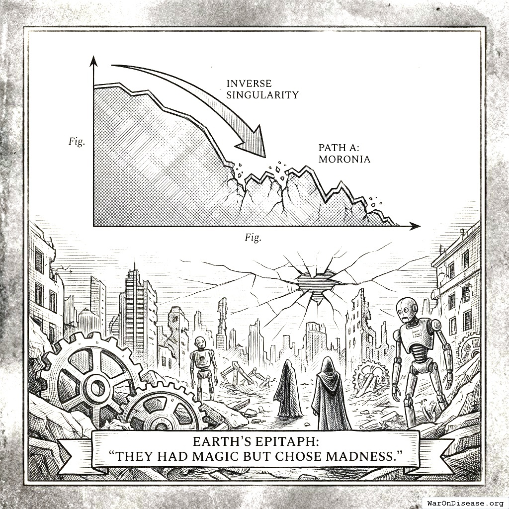 You do nothing. (Your specialty.) The ever-growing dark economy of cybercrime and AI-driven conflict offers your smartest people better salaries than hospitals do. So they take them, because they have student loans. The singularity happens, but it’s an inverse one, a hockey stick pointing straight down. Antibiotics fail. Global systems collapse in the boringly predictable order that every civilization-collapse textbook warned you about. Warlords with AI armies fight over the scraps in a radioactive wasteland. Earth’s final epitaph: “They had the instructions. They ate them.”