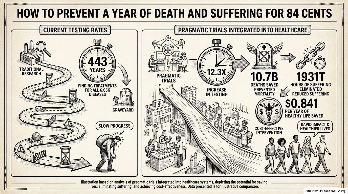 The NIH Pragmatic Trials Collaboratory funds trials at $500K for planning phase, $1M/year for implementation-a tiny fraction of NIH’s budget. The ADAPTABLE trial cost $14 million for 15,076 patients (= $929/patient) versus $420 million for a similar traditional RCT (30x cheaper), yet pragmatic trials remain severely underfunded. PCORnet infrastructure enables real-world trials embedded in healthcare systems, but receives minimal support compared to basic research funding. Additional sources: https://commonfund.nih.gov/hcscollaboratory | https://pcornet.org/wp-content/uploads/2025/08/ADAPTABLE_Lay_Summary_21JUL2025.pdf | https://www.ncbi.nlm.nih.gov/pmc/articles/PMC5604499/