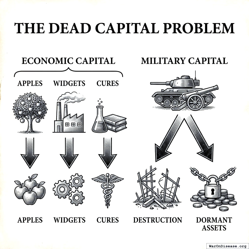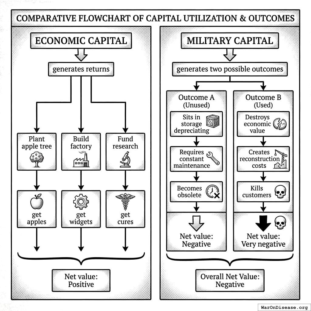 Military money sits in a warehouse, rusts, becomes obsolete, and has negative net value. If used, it destroys value, creates rebuilding bills, and kills your customers. It is the only investment where success means you wasted your money, and failure means everyone is dead.