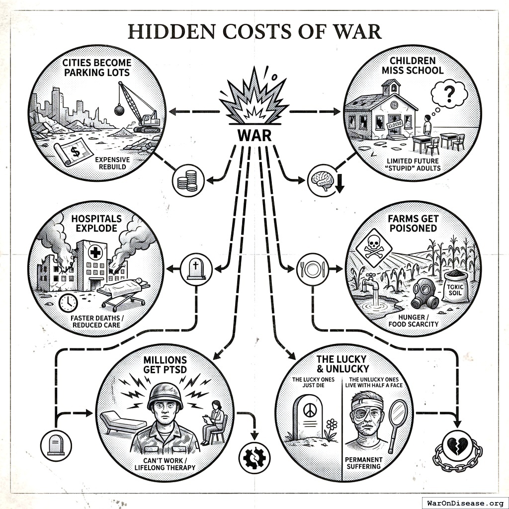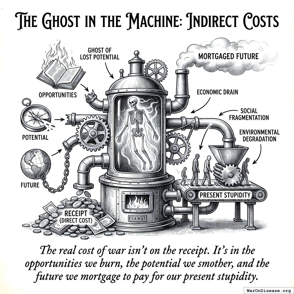 The direct costs are just the sticker price. The real cost of war is what you didn’t buy. Every dollar spent on a missile is a dollar that didn’t cure leukemia, educate a child, or build a bridge that wasn’t going to be blown up.