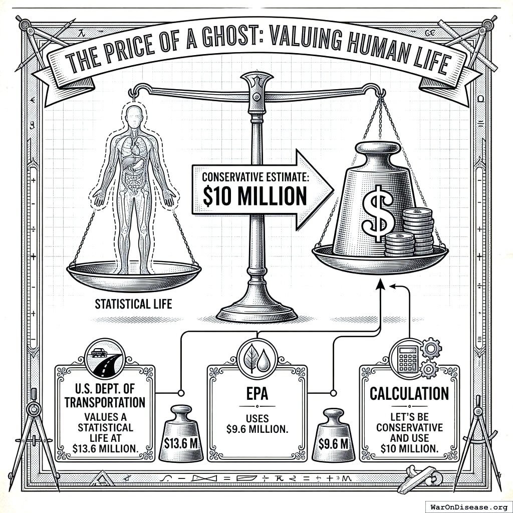 The U.S. Department of Transportation143 says a statistical life is worth $13.6 million131. The EPA says $9.6 million141. Two government agencies, both American, cannot agree on what you are worth. A four million dollar disagreement over the price of a person. We will split the difference and say $10 million, which is generous for a species that keeps blowing itself up.