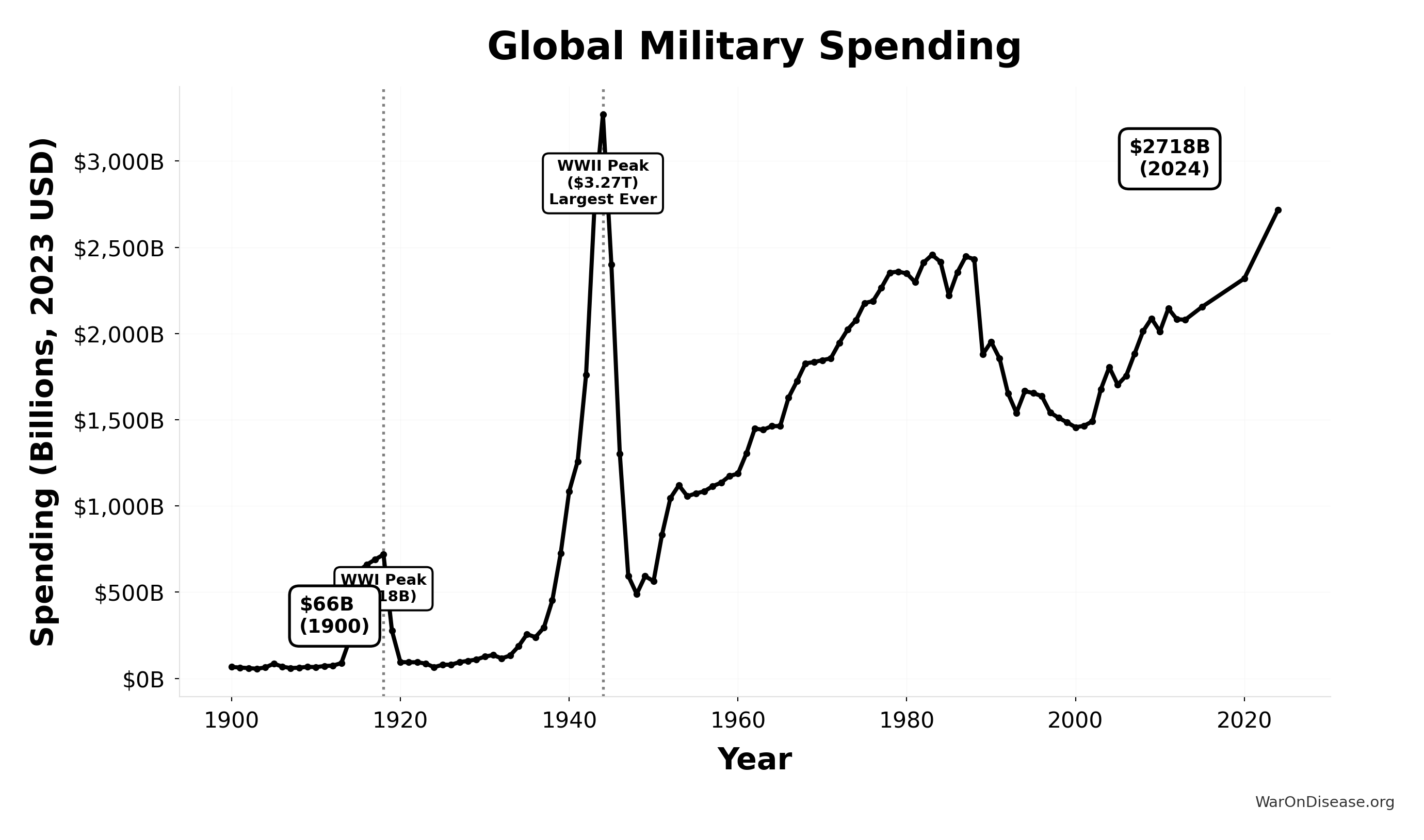 Despite decades of peace and the absence of total global war, current military spending ($2.72T) is 83% of the WWII peak and 41× higher than pre-WWI levels ($66B in 1900). The world spends nearly as much on military today as it did during the largest war in history.