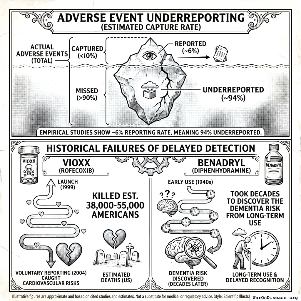 Graham testimony (2004): 88,000-139,000 U.S. heart attacks/strokes from Vioxx; up to 55,000 deaths (40% fatality rate) Lancet study estimate: 88,000 Americans had heart attacks from Vioxx; 38,000 died FDA memo (2004): Vioxx contributed to 27,785 heart attacks and sudden cardiac deaths (1999-2003) High-dose Vioxx: Tripled risk of heart attacks and sudden cardiac death Prescriptions: 92.8 million U.S. prescriptions 1999-2003 Withdrawn: September 30, 2004 after APPROVE trial showed cardiovascular risks Note: Vioxx case demonstrates failure of passive post-market surveillance (FAERS) to detect safety signals in time. Voluntary reporting missed cardiovascular risks for years despite millions of prescriptions Additional sources: https://pmc.ncbi.nlm.nih.gov/articles/PMC534432/ | https://www.npr.org/2007/11/10/5470430/timeline-the-rise-and-fall-of-vioxx | https://www.thelancet.com/journals/lancet/article/PIIS0140-6736(05)67712-4/fulltext