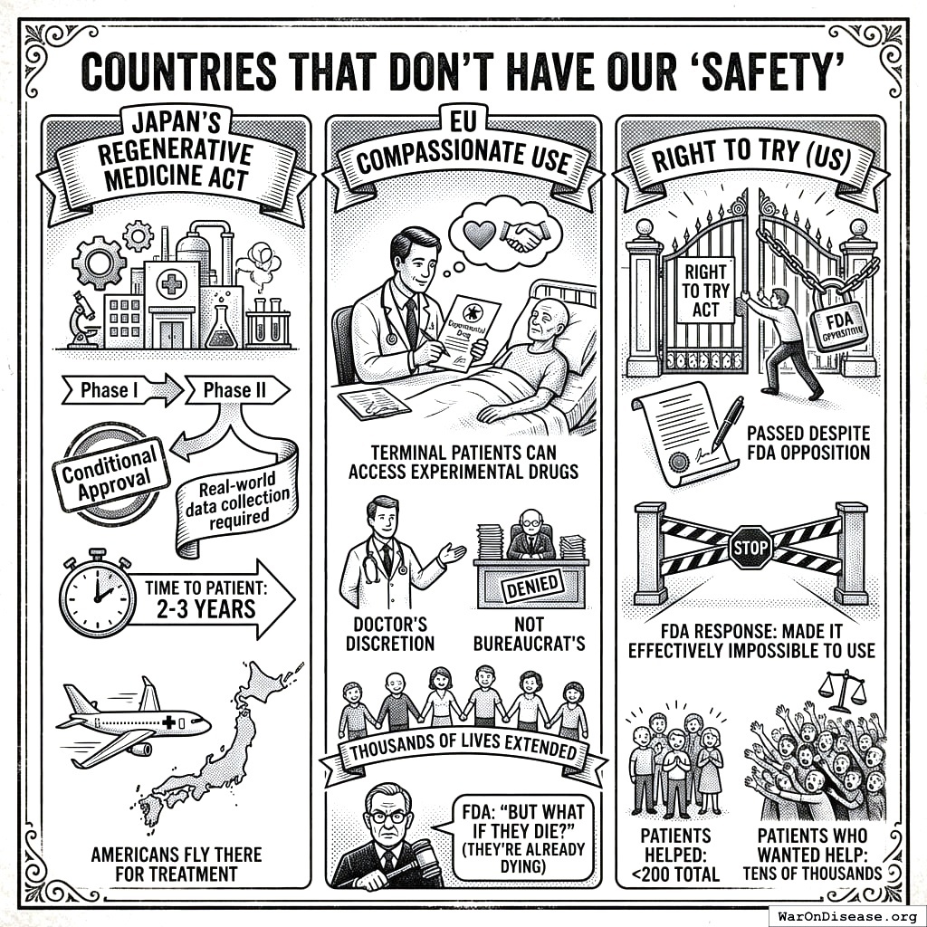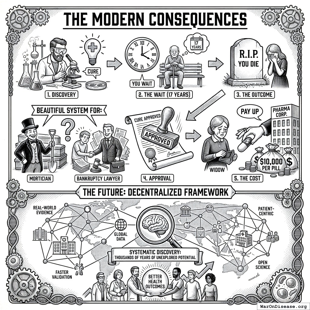 Here’s a news story from the Non-Existent Times by No One Ever, without a picture of all the people who die from lack of access to life-saving treatments that might have been. You can’t photograph millions of people who died from not receiving a drug. There’s no body with a toe tag reading “cause of death: regulatory delay.” They die of cancer, heart disease, Alzheimer’s. The delay that killed them is invisible, so nobody writes the headline.
