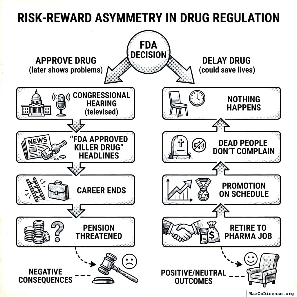 To be fair, this isn’t a conspiracy. It’s just a system where the only career-ending move is letting patients access treatments. If you approve a bad drug, CNN says your name. If you delay a good drug, nobody dies on television. So the rational move is to delay everything, and that’s what happens, and everyone who could object is dead, which does simplify the feedback process.