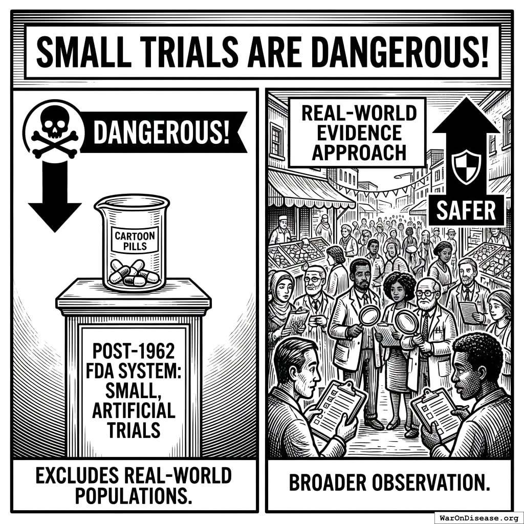regulating efficacy testing via the 1962 Kefauver Harris Amendment. The 1962 regulations made these large real-world efficacy trials illegal. Additional sources: https://www.govtrack.us/congress/bills/87/s1552 | https://www.fda.gov/about-fda/histories-product-regulation/promoting-safe-effective-drugs-100-years | https://pmc.ncbi.nlm.nih.gov/articles/PMC4101807/