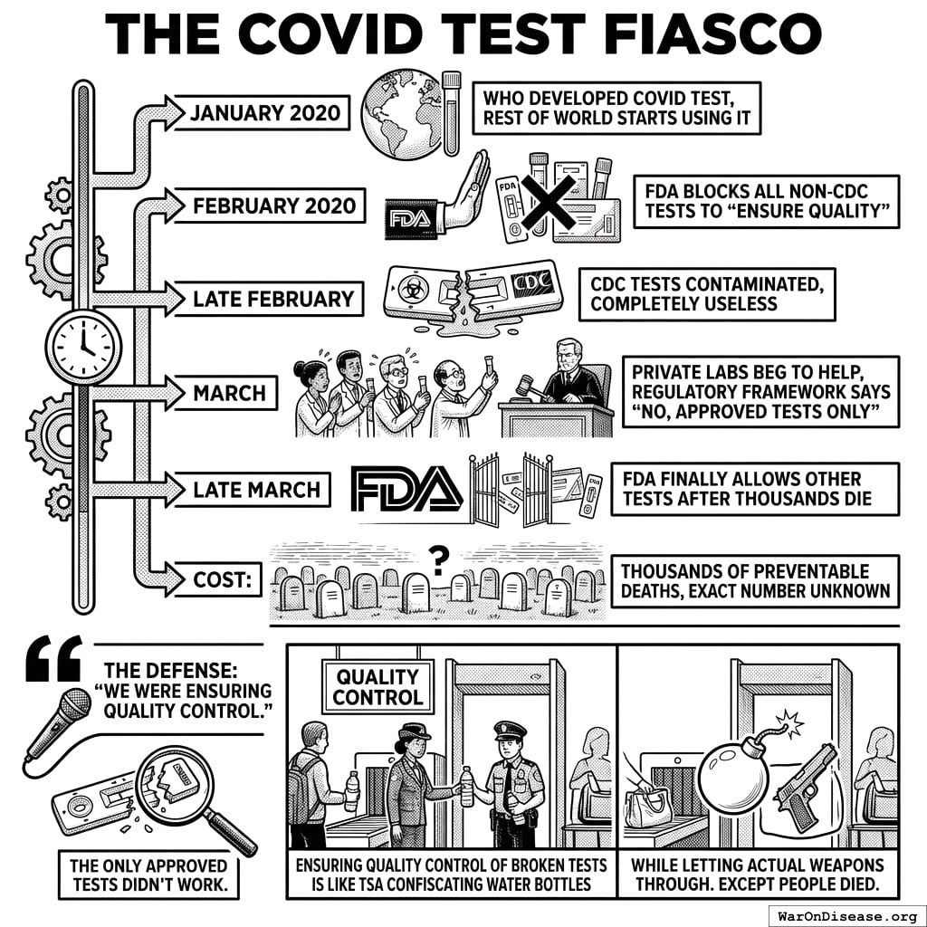 Feb 16, 2020: Seattle research lab ordered to stop COVID testing without FDA approval May 2020: Gates Foundation partnership instructed to discontinue testing until authorization Feb 29, 2020: U. Nebraska finally got FDA permission after Feb 4 special permission Timeline: Critical delays measured in weeks-to-months (Feb-March 2020), not specific "6 months FDA guidance suggested EUAs needed for laboratory-developed tests (LDTs), causing delays By May 2020: 400+ test applications awaiting FDA review Note: Delays were weeks-to-months during critical Feb-March 2020 period, not continuous "6 months." FDA intervention added minimal value while contributing to deadly delays Additional sources: https://www.cnn.com/2020/04/09/politics/coronavirus-testing-cdc-fda-red-tape-invs/index.html | https://www.yalelawjournal.org/forum/deadly-delay-the-fdas-role-in-americas-covid-testing-debacle | https://oig.hhs.gov/oei/reports/OEI-01-20-00380.asp