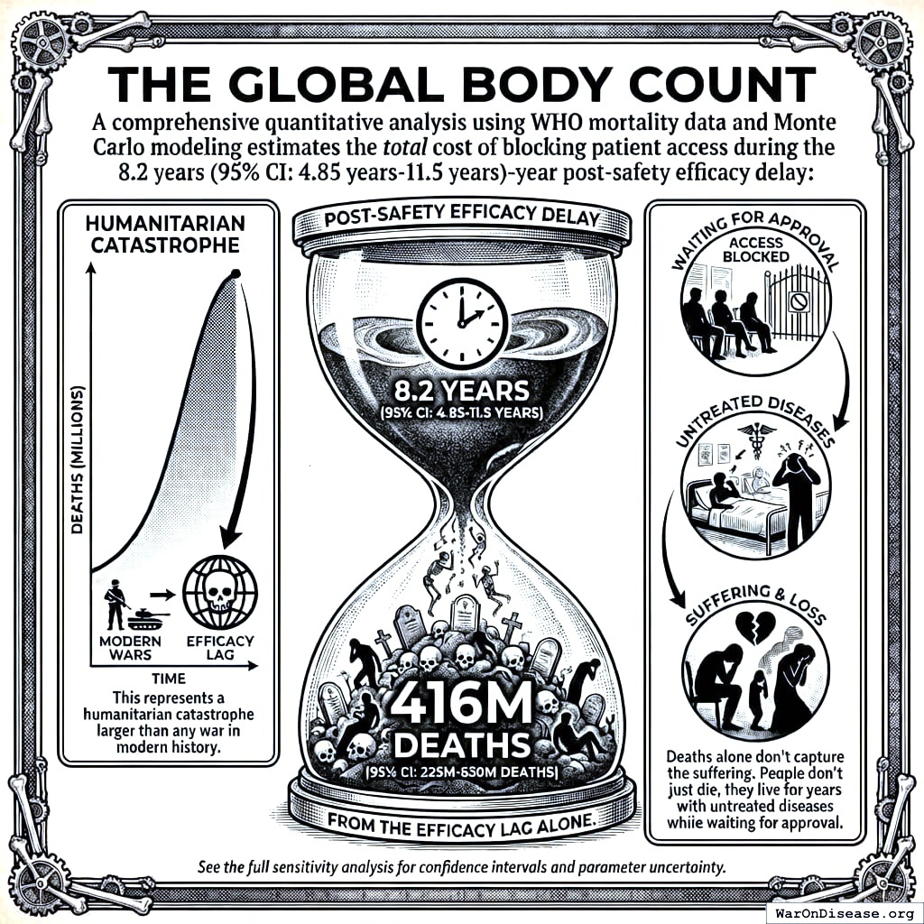 A comprehensive quantitative analysis using WHO mortality data estimates the total cost of the 8.2 years post-safety efficacy delay (the lag after drugs are known safe): 416 million deaths eventually avoidable deaths.