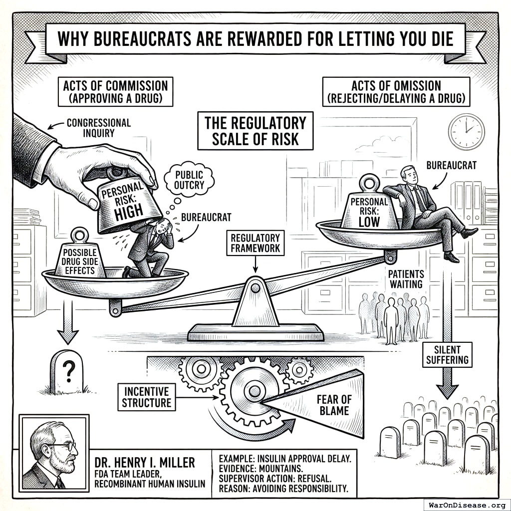Dr. Henry I. Miller ran the FDA team reviewing recombinant human insulin in the early 1980s. Mountains of evidence showed it was safe and effective. His supervisor refused to approve it. If someone died from the drug, heads would roll. If people died waiting for the drug? Nothing happens.