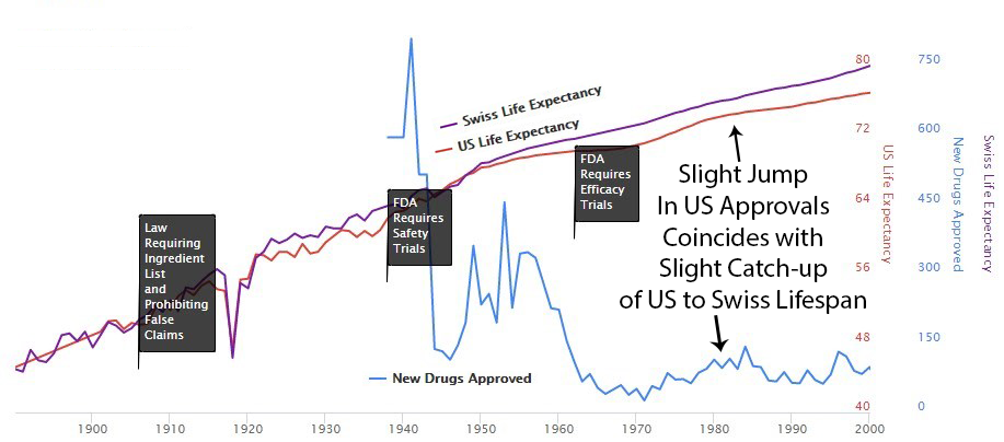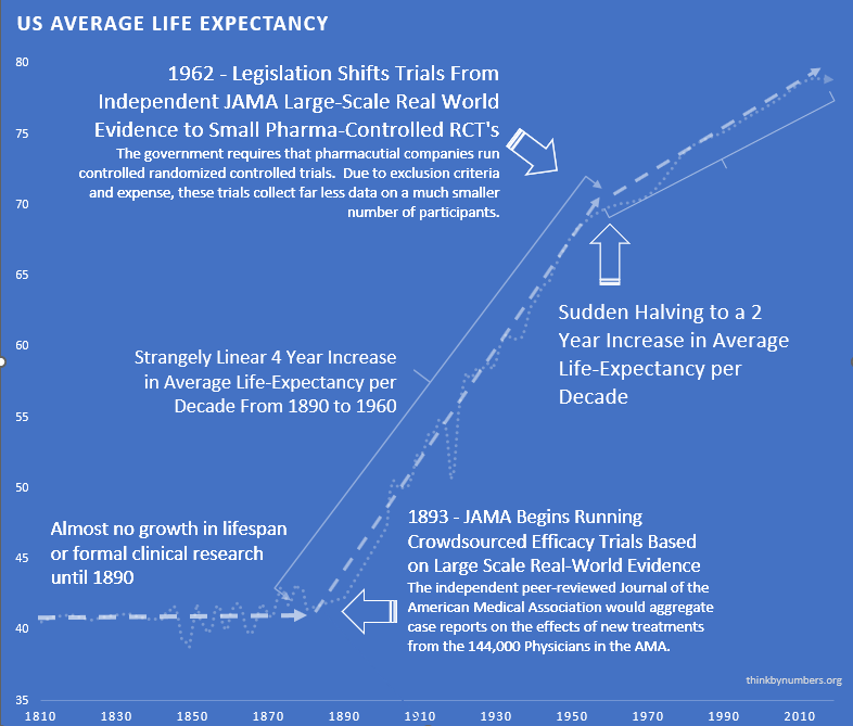 Before 1962, 144 thousand physicians tested treatments on real patients and published results. Life expectancy grew 3.82 years every decade119 for 80 straight years. Things were going well. Naturally, Congress intervened.