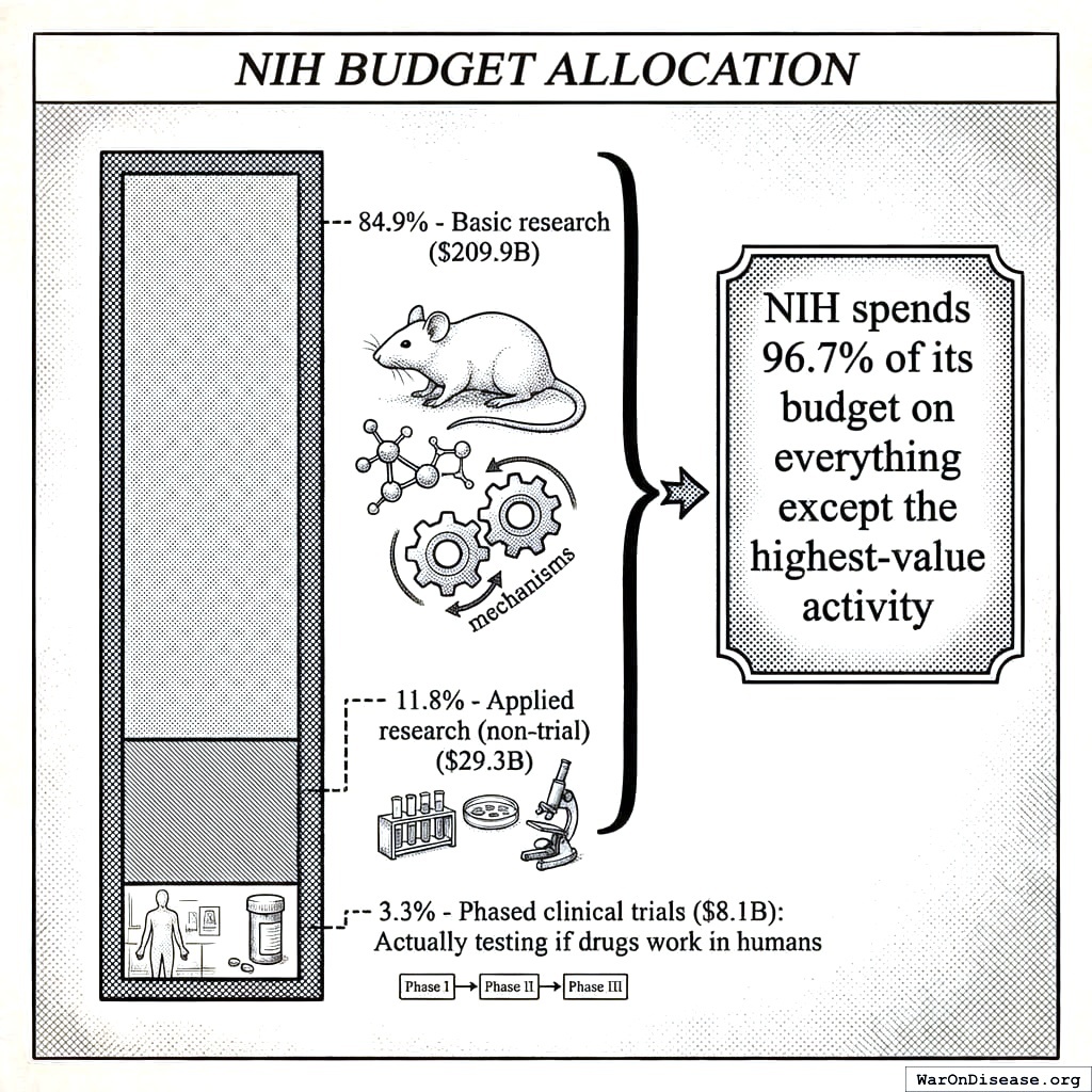 Of $247 billion the NIH spent over a decade, exactly 3.3% went to testing which of the thousands of known-safe treatments actually work in humans152. The other 96.7% funded understanding disease mechanisms, translating discoveries toward (but never into) clinical use, training scientists, observational programs that spend billions watching disease without treating it, and a side quest engineering bat viruses, which is called “research” the way watching someone drown from a boat is called “lifeguarding.”