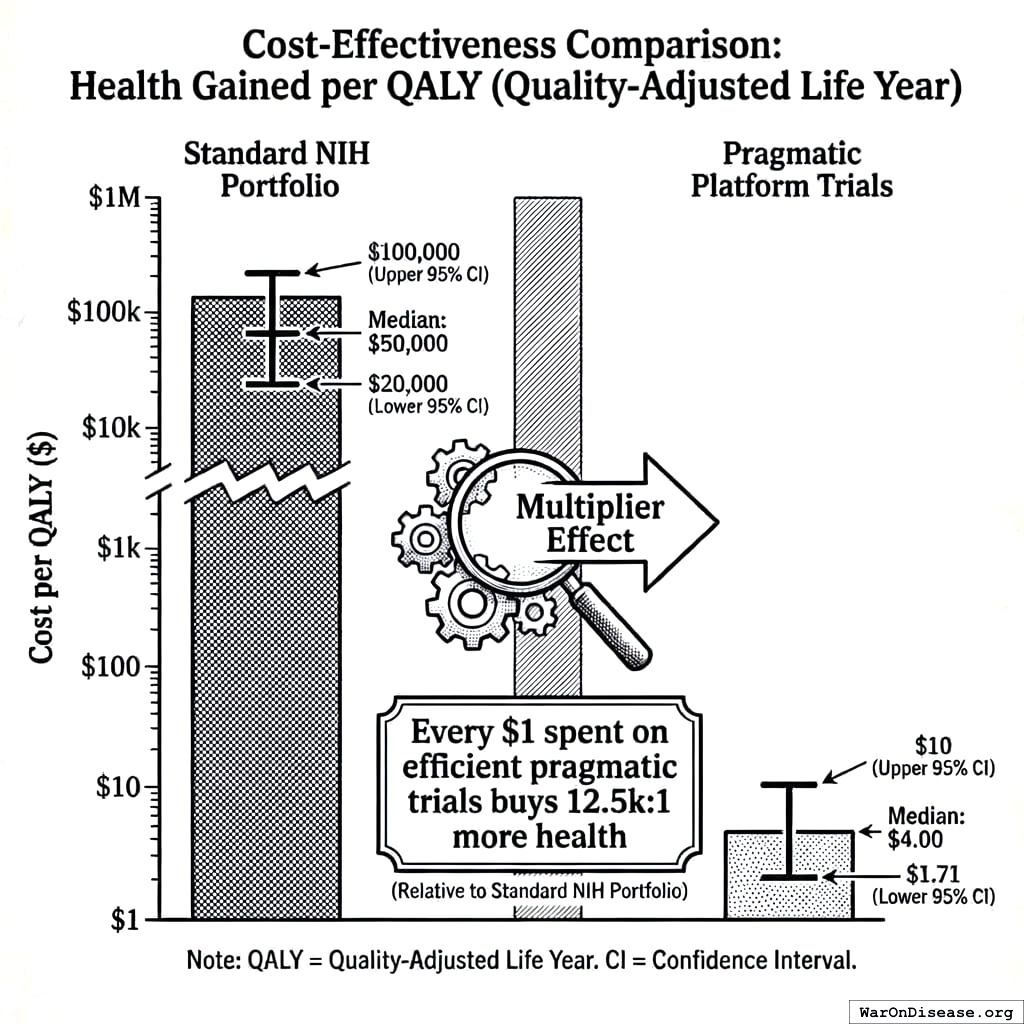 The NIH Pragmatic Trials Collaboratory funds trials at $500K for planning phase, $1M/year for implementation-a tiny fraction of NIH’s budget. The ADAPTABLE trial cost $14 million for 15,076 patients (= $929/patient) versus $420 million for a similar traditional RCT (30x cheaper), yet pragmatic trials remain severely underfunded. PCORnet infrastructure enables real-world trials embedded in healthcare systems, but receives minimal support compared to basic research funding. Additional sources: https://commonfund.nih.gov/hcscollaboratory | https://pcornet.org/wp-content/uploads/2025/08/ADAPTABLE_Lay_Summary_21JUL2025.pdf | https://www.ncbi.nlm.nih.gov/pmc/articles/PMC5604499/