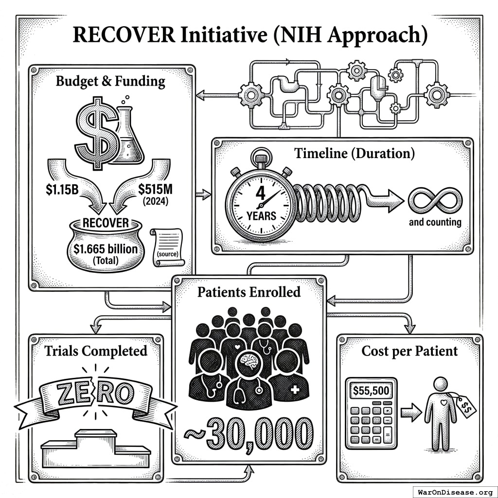 Nearly 600 potential treatments for Long COVID have been identified. At RECOVERY trial efficiency ($500/patient, 5,500 patients per treatment), $1.665 billion buys 600 completed trials. The NIH received $1.665 billion138. Over 4 years139, they completed zero139.