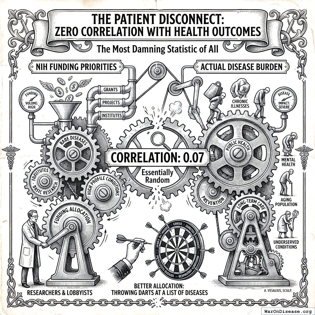 That is not a typo. On a scale of 0 (random) to 1 (perfect), the NIH scores “basically a coin flip.” A dartboard would allocate research funding more rationally. A drunk person throwing darts at a list of diseases would produce a funding allocation that correlates more closely with actual disease burden than the National Institutes of Health, which employs 20,000 people and has been doing this for 50 years. The dartboard doesn’t even need to be in the building.