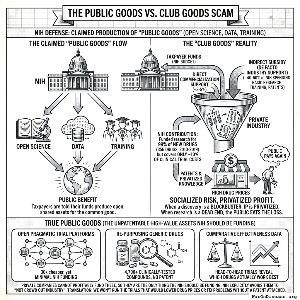The NIH claims to produce “public goods” like open science and training. What it actually produces is a free R&D department for pharmaceutical companies, funded by the same people who then pay full price for the drugs.