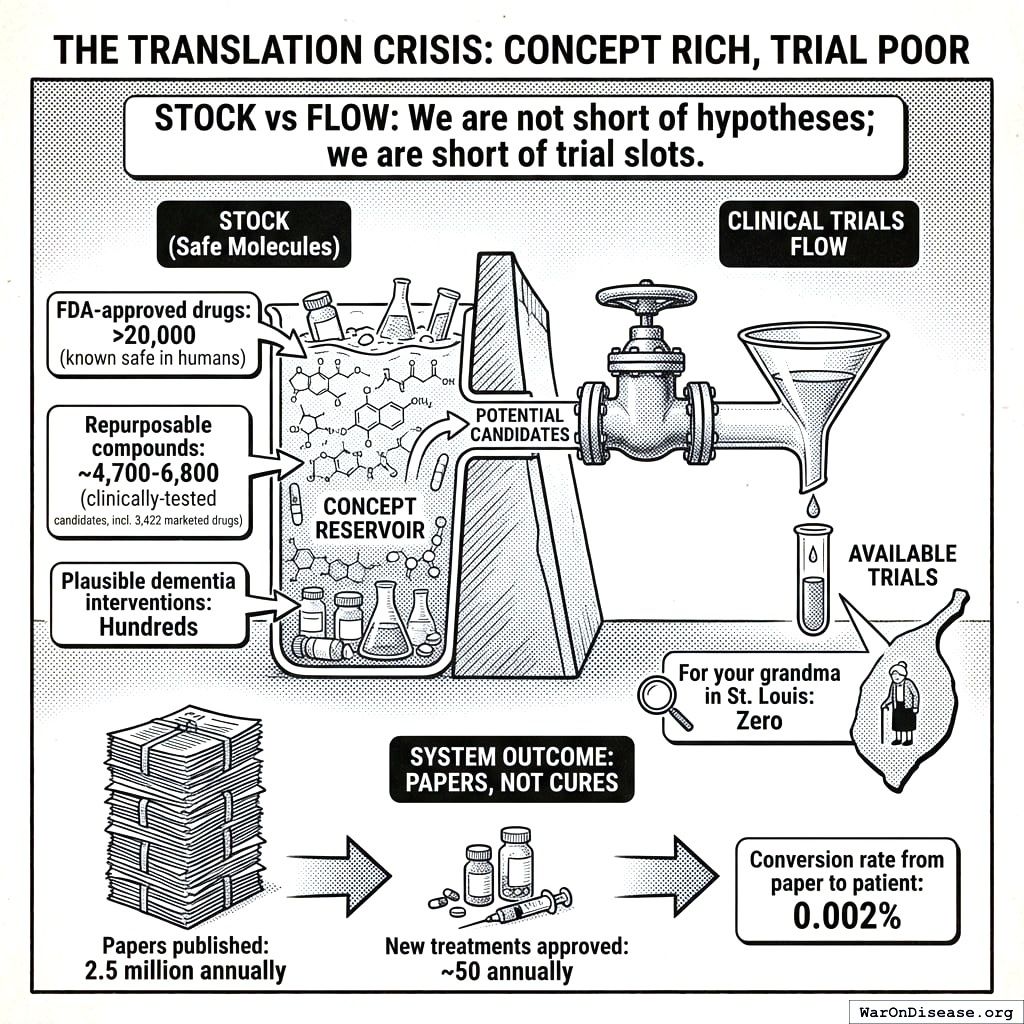 There are over 20 thousand FDA-approved drugs that are known to be safe in humans. Thousands more clinically-tested candidates are gathering dust143, including over 3,000 marketed drugs that could be repurposed for diseases nobody’s tried them on. In Alzheimer’s alone, researchers have identified hundreds of safe drugs worth testing, yet less than 10% are in active trials144. And the number of clinical trials available for your grandma in St. Louis? Zero. You have a warehouse of safe molecules that have never been systematically tested for new uses. The warehouse is full. The testing facility is closed for a team-building retreat.