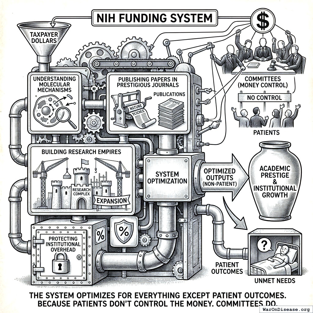 Patients want medicine that works, access to experimental therapies, trials they can join, and a cure before they die. The NIH funds molecular mechanisms, research empires, and institutional overhead. These two lists do not overlap. They don’t even live in the same neighborhood.
