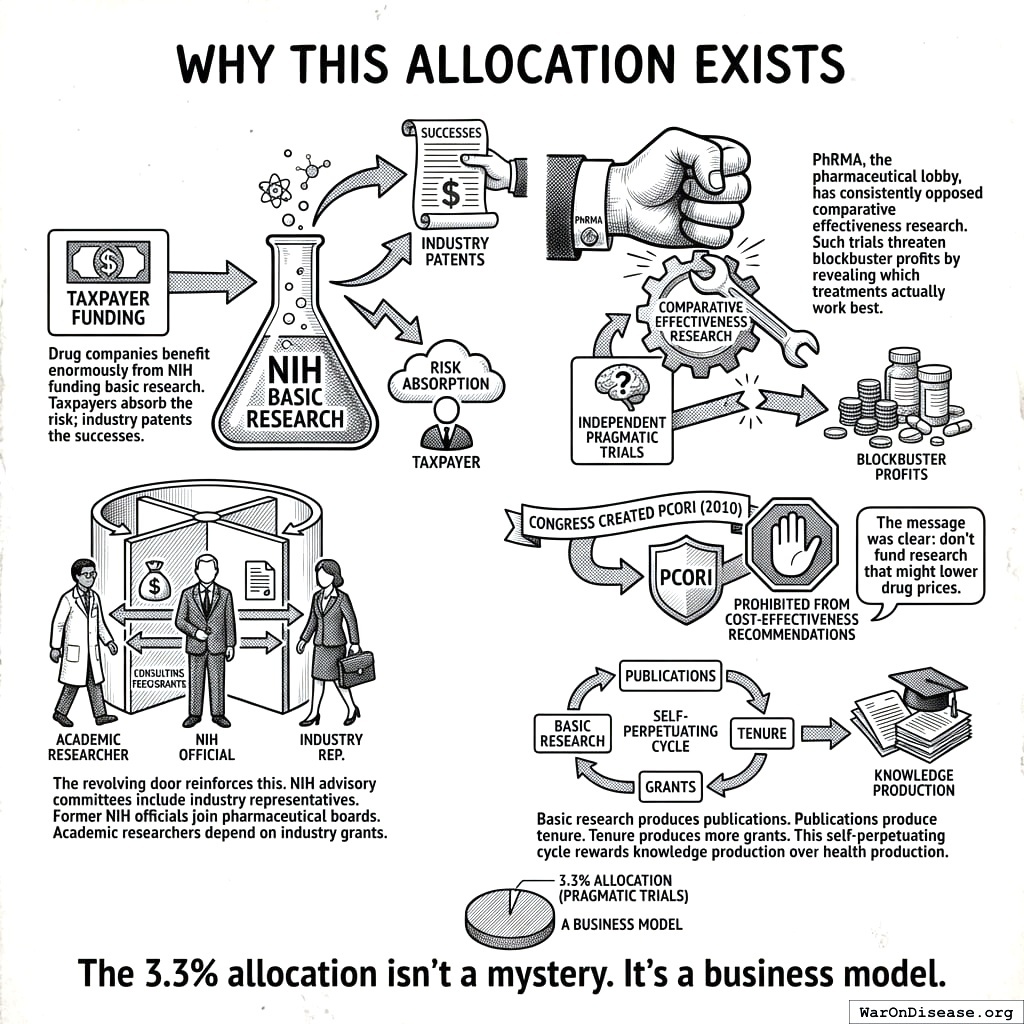 The only things the NIH should fund are things private companies cannot profitably fund: open pragmatic trial platforms, repurposing of generic drugs where no patent means no profit means no interest, and comparative effectiveness data from head-to-head trials revealing which drugs actually work best (pharma’s nightmare, your potential salvation). Instead, the NIH explicitly avoids them to “not crowd out industry.” Translation: “We won’t run the trials that would lower drug prices, because the people who set drug prices asked us nicely.” They asked nicely and also spent $127M on lobbying, but the niceness was noted.