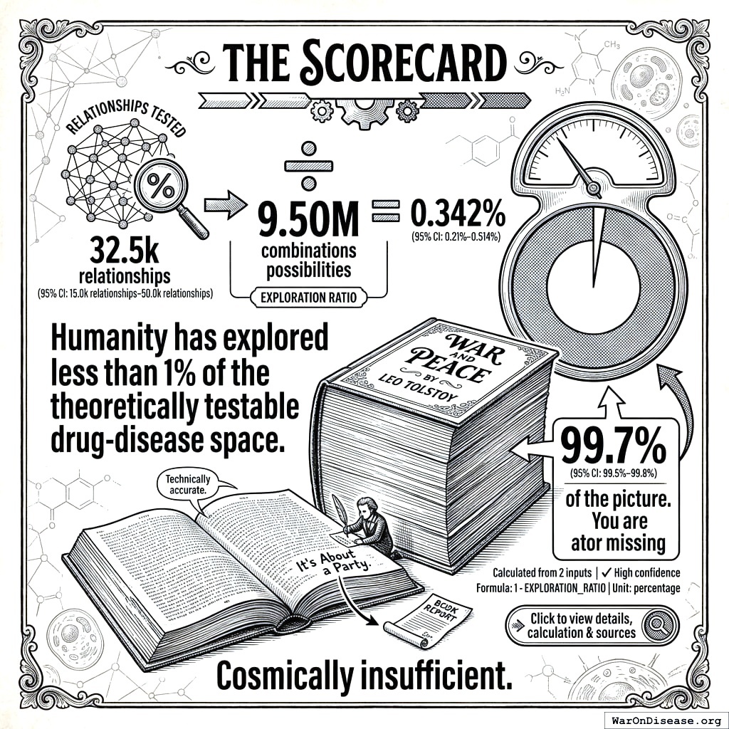 I want to sit with that for a moment. You have safe compounds. You have sick people. You have the ability to introduce them to each other. You have done this 0.342% of the time. The other 99.66% of introductions have never been made. Not because they wouldn’t work. Because the molecule didn’t have a marketing budget.