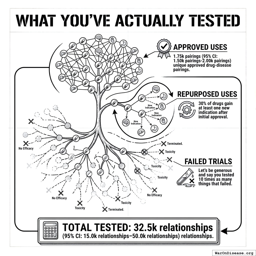 - Approved uses: 1.75 thousand pairings unique approved drug-disease pairings. This is your entire medical canon. Five thousand years of civilization. Libraries of medical journals. Nobel Prizes. White coats. Stethoscopes. All of it produced this number.