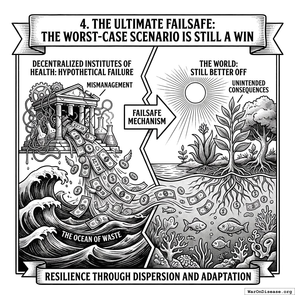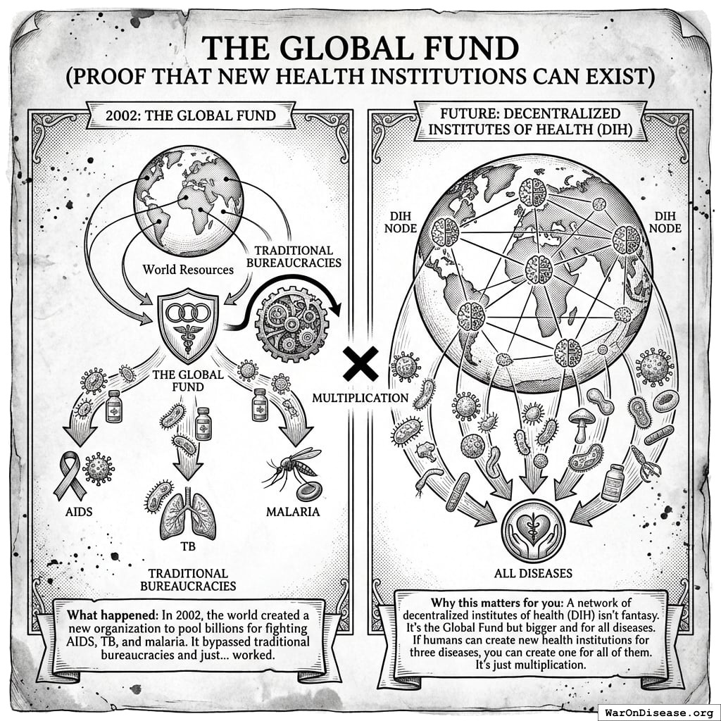 Why this matters for you: A network of decentralized institutes of health (DIH) isn’t fantasy. It’s the Global Fund but bigger and for all diseases. If you can create new health institutions for three diseases, you can create one for all of them. It’s multiplication. You learned this when you were six.