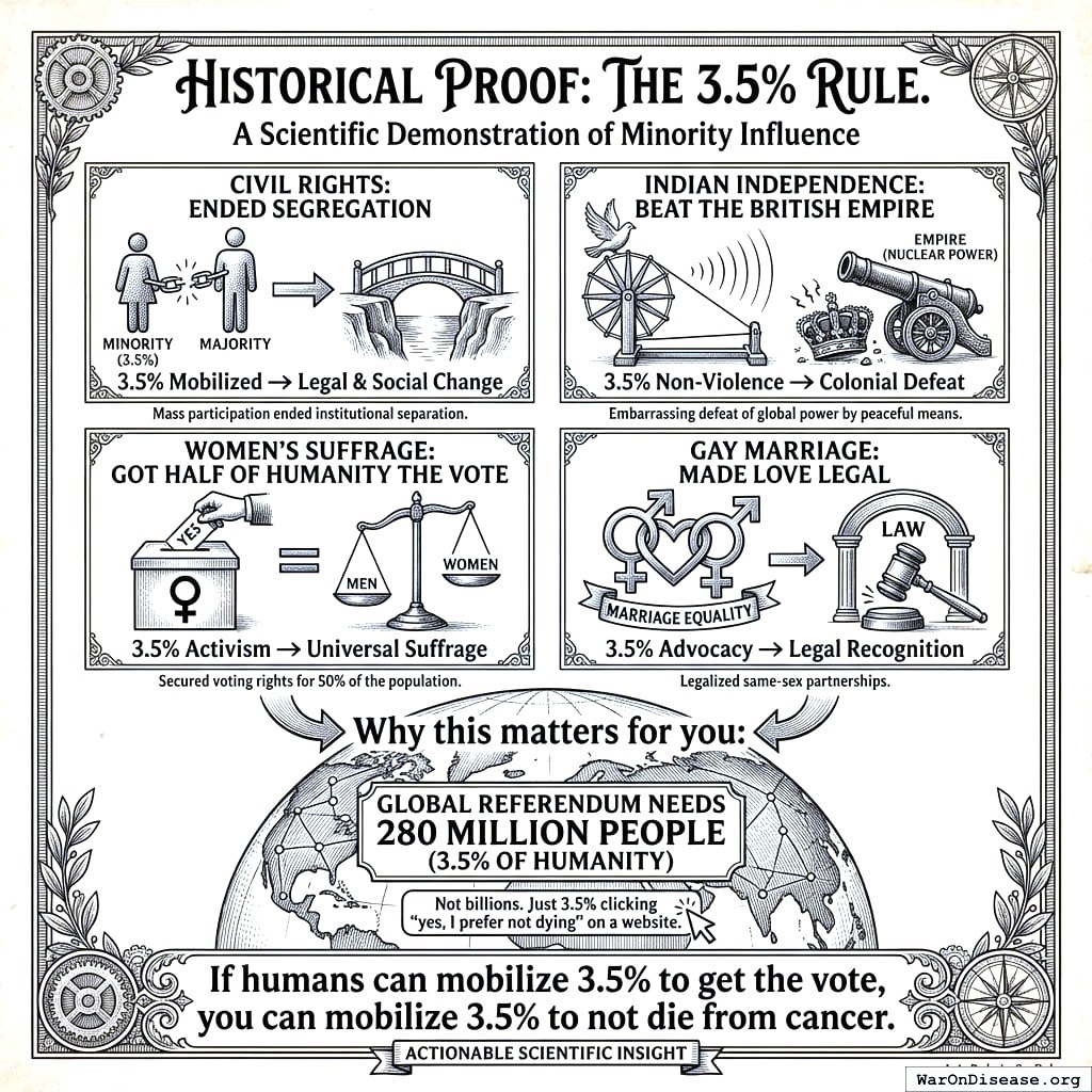 Why this matters for you: One person in every classroom. One family on every block. That’s 3.5%. The global referendum needs 280 million people (3.5% of humanity). Not billions. Just 3.5% clicking “yes, I prefer not dying” on a website. The internet reaches 5 billion148. If humans can mobilize 3.5% to get the vote, you can mobilize 3.5% to not die from cancer. Math says it wins.