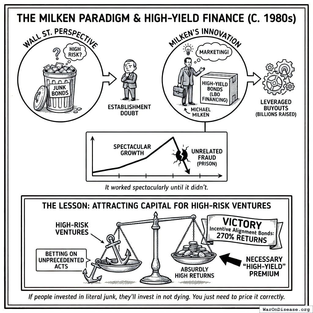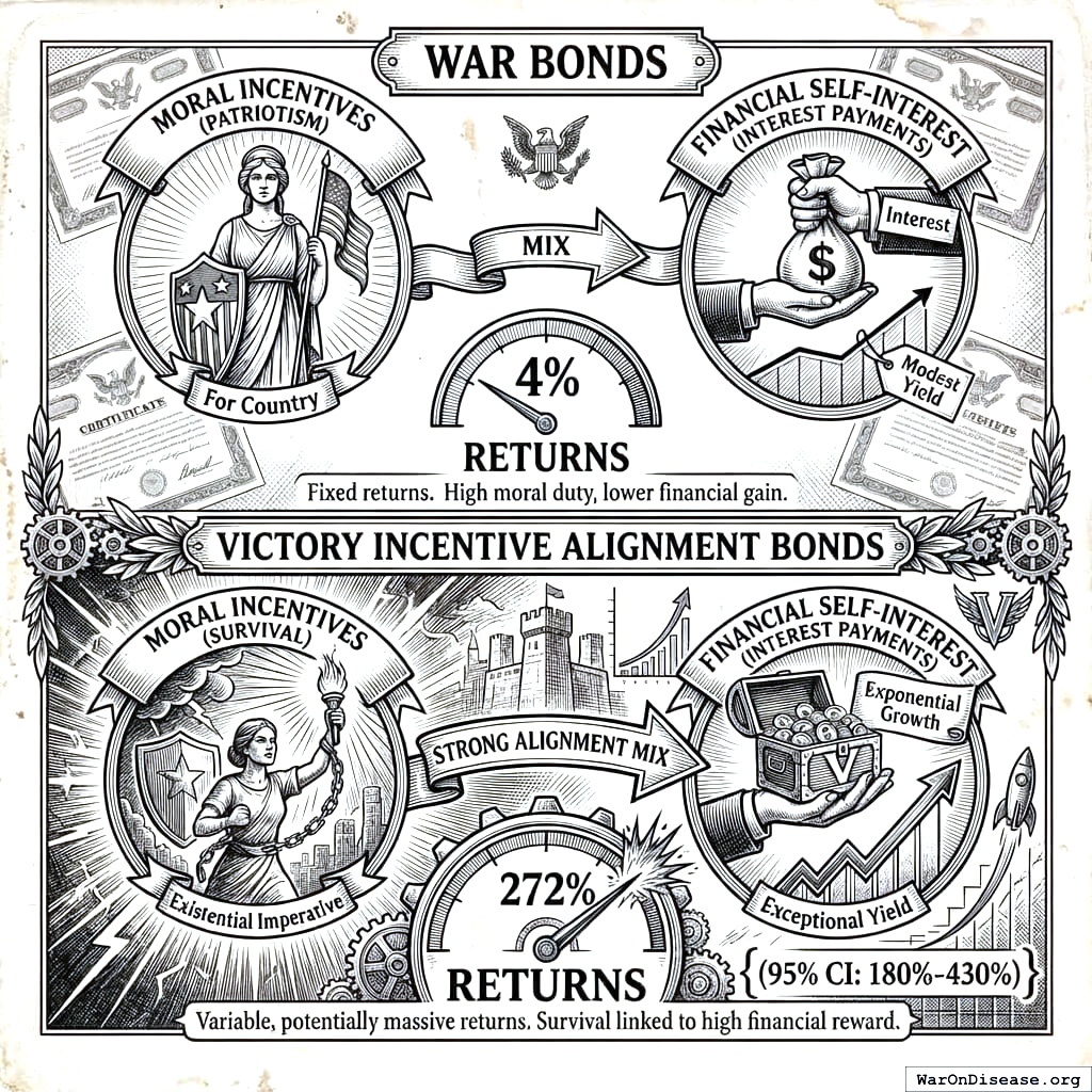The formula worked: mix moral incentives (patriotism) with financial self-interest (interest payments). You’re applying it to a different war: the one against your own mortality. When saving the world is profitable, people trip over each other to fund it.