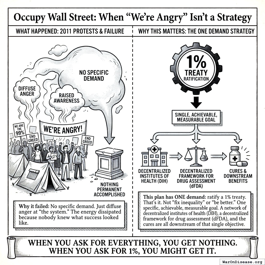 Why this matters: This plan has ONE demand: ratify a 1% treaty. That’s it. Not “fix inequality” or “be better.” One specific, achievable, measurable goal. You want to change one number from 0 to 1. Ambition is inspiring, but subtraction is effective. A network of decentralized institutes of health (DIH), a decentralized FDA153,154, and the cures are all downstream of that single objective.