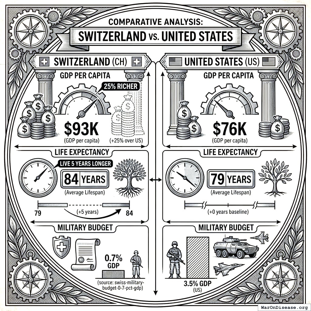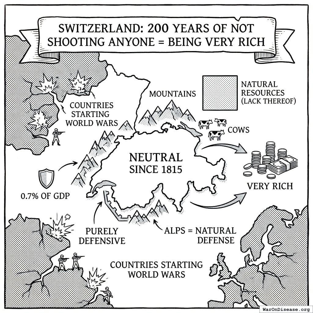 Why this matters for you: Peace dividends compound over centuries. Switzerland proves you don’t need oil, colonies, or weapons to get rich. Just stop wasting money on things that explode. They’ve been doing this for 200 years. You’re asking for a 1% start.