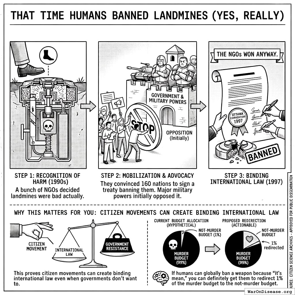 Why this matters for you: This proves citizen movements can create binding international law even when governments don’t want to. If humans can globally ban a weapon because “it’s mean,” you can definitely redirect 1% of the murder budget to the not-murder budget. And they did it with fax machines. Just pissed-off citizens with fax machines. You have the internet.