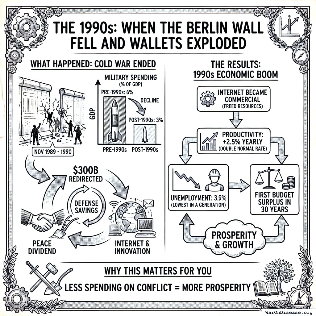 What happened: Cold War ended. Military spending dropped from 6% of GDP to 3%. That’s $300B redirected from pointing missiles at Russia to literally anything else.