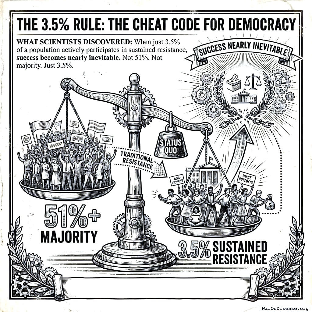 What scientists discovered: When just 3.5% of a population actively participates in sustained resistance, success becomes nearly inevitable. Not 51%. Not a majority. Just 3.5%.