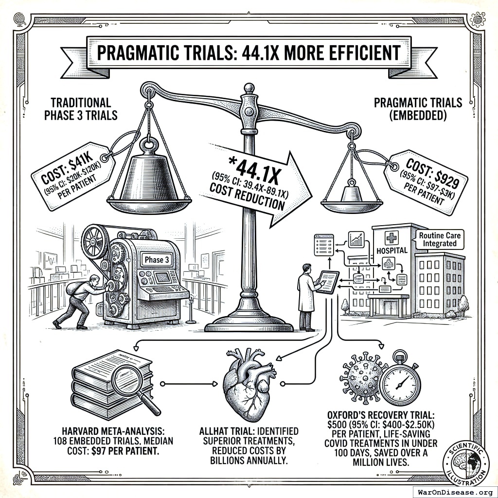 A Harvard meta-analysis of 108 embedded pragmatic trials found median costs of just $97 per patient136. The ALLHAT trial showed pragmatic designs can identify superior treatments and reduced healthcare costs by billions annually137. So the cheap way is also the better way. Happens more often than you’d think.