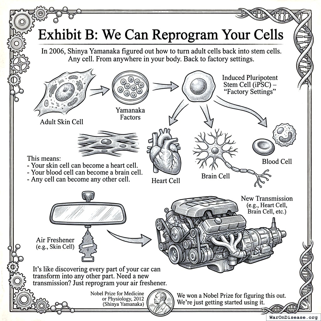 In 2006, Shinya Yamanaka figured out how to turn adult cells back into stem cells138. Any cell. From anywhere in your body. Back to factory settings. Like holding down the reset button, except on a skin cell. And it works.