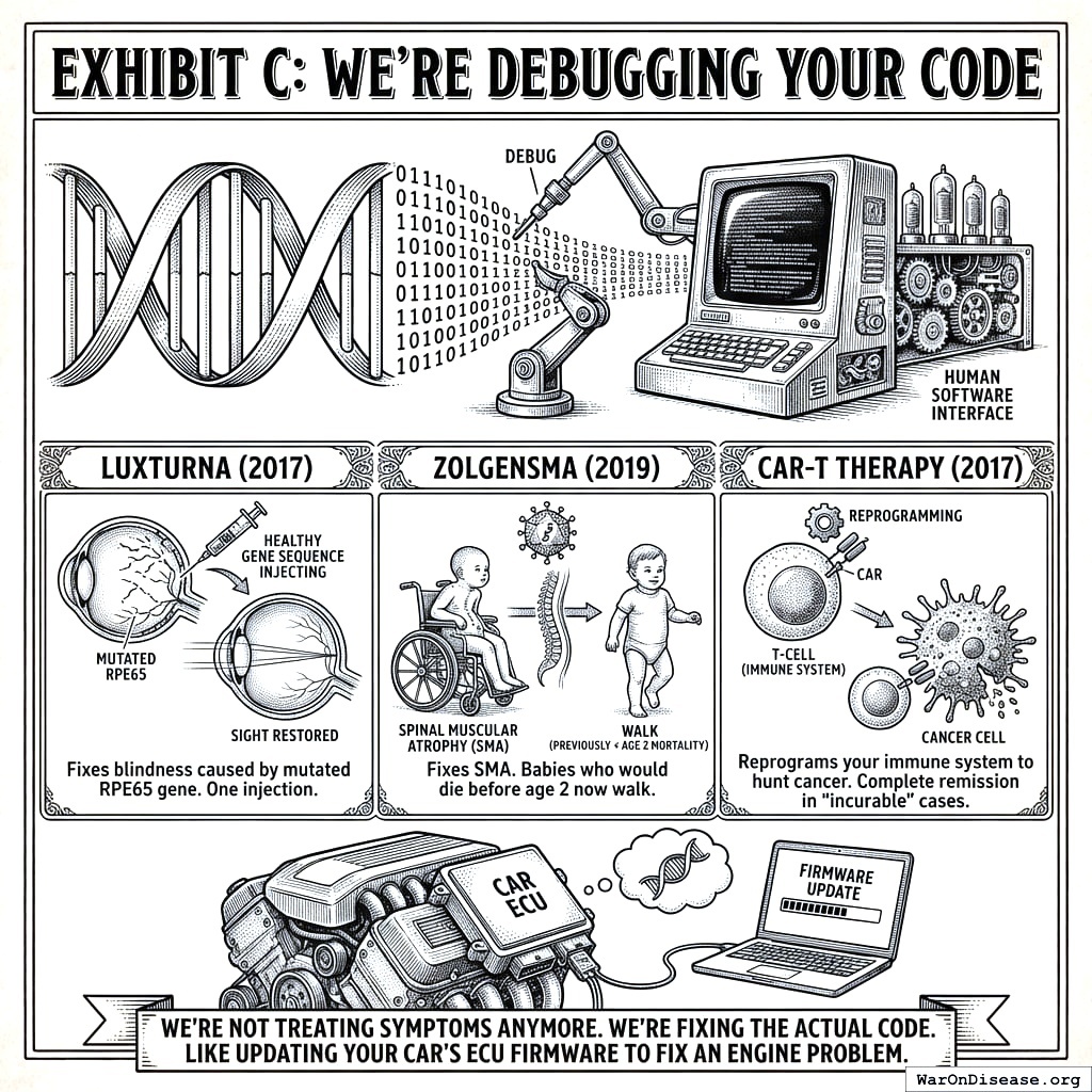 - Luxturna139 (2017): Fixes blindness caused by a mutated RPE65 gene. One injection. Sight restored. The entire disease was a typo. One letter wrong, and you couldn’t see. They fixed the letter.
