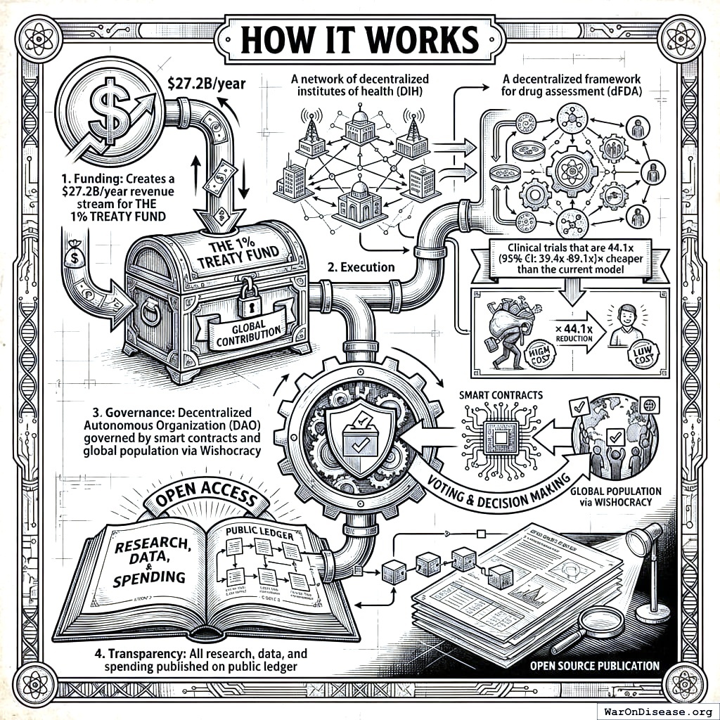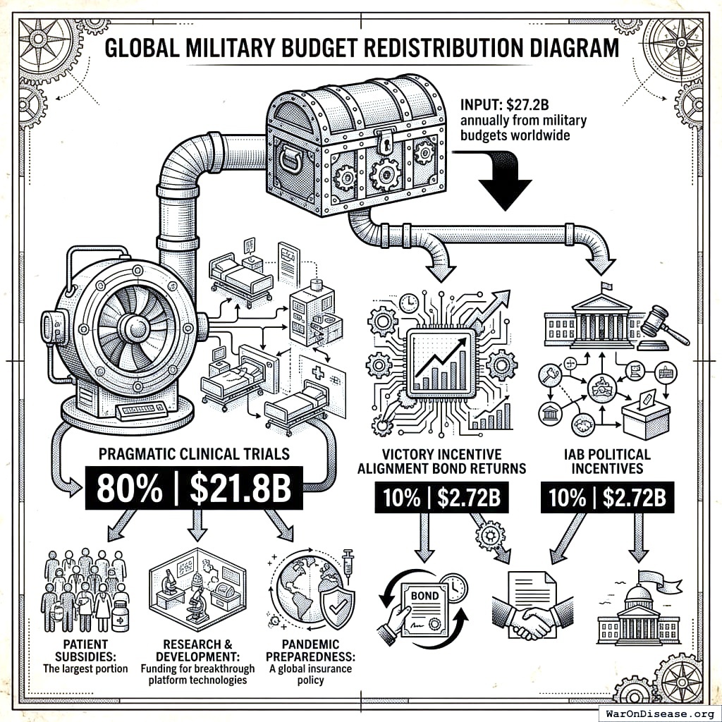 war-on-disease, 1-percent-treaty, medical-research, public-health, peace-dividend, decentralized-trials, dfda, dih, victory-bonds, health-economics, cost-benefit-analysis, clinical-trials, drug-development, regulatory-reform, military-spending, peace-economics, decentralized-governance, wishocracy, blockchain-governance, impact-investing