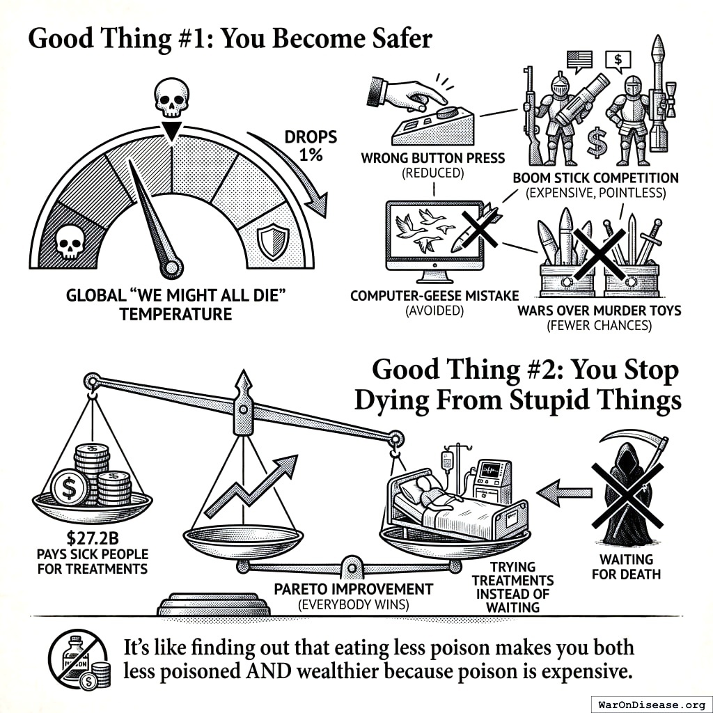 Economists call this a Kaldor-Hicks improvement, which is their way of saying “the winners win more than the losers lose, and we’ve decided that counts.” In practice, some weapons manufacturers lose 1% of their contracts. In exchange, they and everyone they love become less likely to die of cancer. Most people consider this a good trade. Defense contractors are still doing the math.