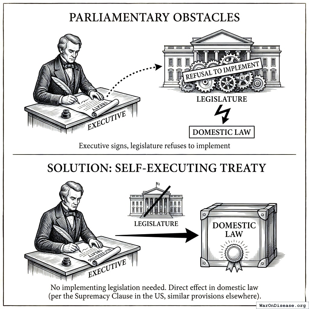 Solution: The treaty obligates the percentage; Congress implements via the annual National Defense Authorization Act (NDAA). After Medellin v. Texas (2008), the Supreme Court made clear that not all treaties are self-executing, so the treaty doesn’t try to bypass Congress. It creates a binding international obligation that Congress fulfills through its normal appropriations process, the same way NATO’s spending commitments work. The IAB mechanism ensures legislators have a personal incentive to include the 1% line item every year.
