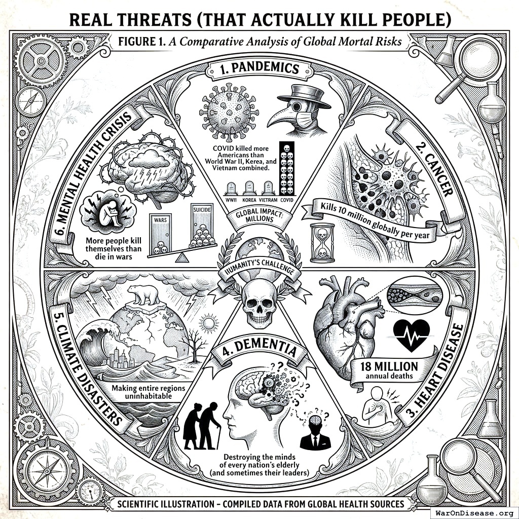 Diseases kill more people every year than all the wars combined. We decided to keep the war budget though. Just to be safe.