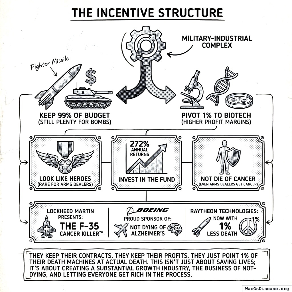 The military-industrial complex gets to keep 99% of their budget (still plenty for bombs), pivot 1% to biotech (the health market is growing; the bomb market just got 1% smaller), look like heroes (rare for arms dealers), invest in the fund (VICTORY Incentive Alignment Bonds151 pay 272% annually), and not die of cancer (even arms dealers get cancer). Especially the not dying of cancer part. The CEO of Lockheed Martin has the same cells you do. Those cells malfunction on the same schedule. No amount of missile production has ever cured a tumor.
